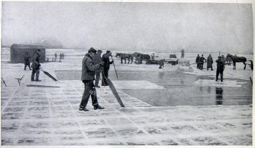 Commercial ice harvest grew to a huge, labor intensive business before the invention of efficiently manufactured ice obviated it around World War I. Public bond issues of $5 million (1902) and $6 million (1912) greased the industry. Knickerbocker Ice of New York, for instance, a large player, reported working capital of $2 million in 1881, a staggering figure considering its employees earned only $1.50 a day. Its Manhattan distribution yards on 20th Street busied 2000 men, 500 wagons, and 1000 horses. Like the giant gas storage tanks at ports today, 134 large storage facilities, some preserving by insulation alone as many as 50,000 tons of ice, dotted the Hudson River. Blocks of winter ice chilled meat and produce that flooded into cities year round via the new railroads and the Erie Canal. Large quantities of frozen meat were exported to Europe, with ships sometimes carrying 60,000 tons of refrigerated boxes (one cubic foot of ice weighs 60 pounds.) Nature’s ice enabled local butcher shops, fish mongers, restaurants, breweries and, hauled up by block and tackle pulleys atop brownstone facades, even the humblest family larders.