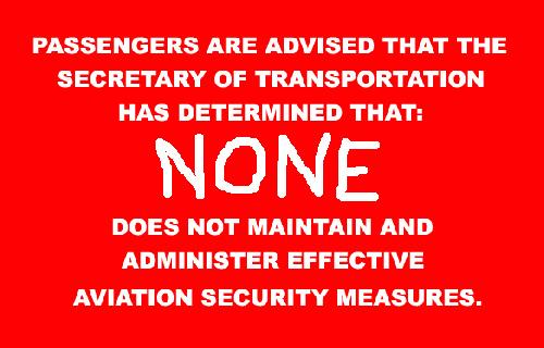 This is an intensely awkward byproduct of signage. Is it a sign for sign’s sake? Is it an item on a standard airport checklist that, while irrelevant here, needs to be present for the sake of uniformity? Is it a typographical error? Is NONE an acronym for an airport agency? Is the sign a prank? Is it a logical deduction that since “NONE does not” therefore everyone does maintain and administer effective security measures? Is the use of the double negative one of those measures? And if so, how extensive is this security anyway that we all maintain and administer it effectively?