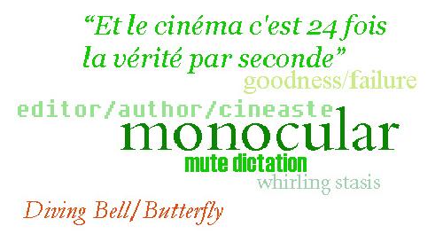 The brilliance of the film does not stem from Bauby’s acts, though: it is our treatment that makes it so compelling—that of the audience, and that of the camera itself. The subjugation of our critical distance and the cooption of our sense of freedom by the camera’s frame refuse release. We think, sub-vocalize, and strain to see as Bauby does. We lust as Bauby does (skirts, lips, tongues); we yearn like him (for mistress, stenographer, father’s love). We dwell as Bauby, and intone with him as he spells out his hopes in indefeasible slowness. The choking pace and the bright eyes of prayerful women lend impossibility the glimmer of escape. We recoil as he does when that glimmer is of his/our own image—“please, no. let that not be me.” And, the lie: “I know how this will end. I get up. It was all a dream.”